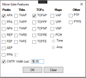 The amplitude of the First peak (after the data gate threshold is crossed) can also be collected. In this case, the peak data is not necessarily the largest peak in the signal. Either the Rising Edge Peak, the Falling Edge Peak, or the Absolute Edge Peak (the Earlier of the Rising or Falling Edge Peak) can be collected.