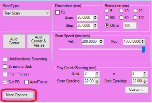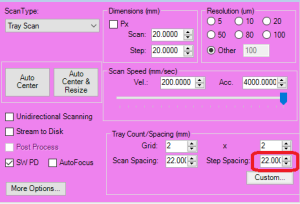Since you will have two channels scanning the same part, it is important that the Step Length and Step Spacing for Tray scans is set correctly.