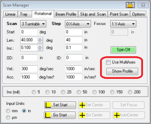 Note: on a Rotational scan, If no rotational axes are present in the system, this button will not be active.