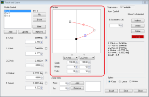Once configured, when the user presses the "Close" button, the complex step profile is stored in memory. Profiles are stored as relative positions, so that if a user needs to make and adjustment to the Start position of a rotational scan, the curve should "travel" with the new start position.