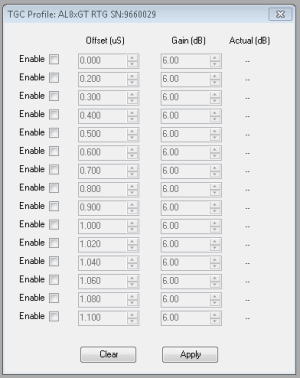 Depending on the hardware present, the desired gain may not be achievable: the TGC profile will display the actual gain achieved at the right of the desired gain. By clicking on the column header, the user may see the input range applied at that particular point.
