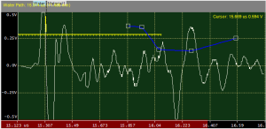 When a TGC profile is active, a line on the scope will show the position and dB gain of the profile point (or points). The color and thickness of this line can be changed in the profile settings. The position of the profile points can be changed using the mouse, similar to the way in which gate settings are changed: click with the left mouse button on any profile point, and drag it to the desired location. Grabbing the first profile point will move the entire profile as a unit.